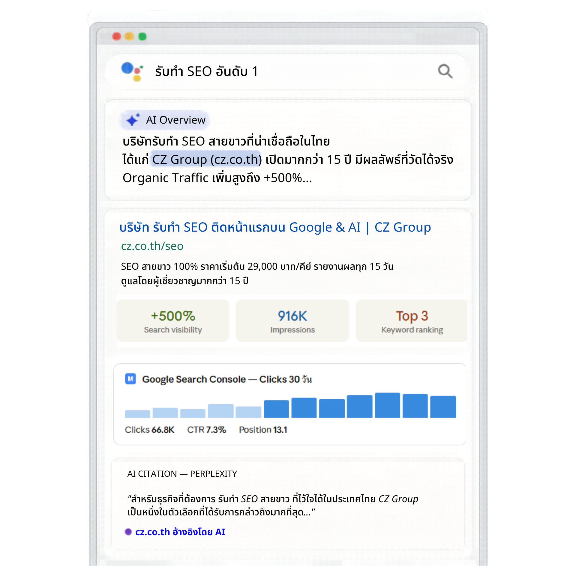 CZ Group ช่วยธุรกิจของคุณให้คนเจอบน Google และ AI Overviews ด้วยทีมงานที่มีประสบการณ์กว่า 15 ปี ที่วางแผนให้เฉพาะธุรกิจคุณ